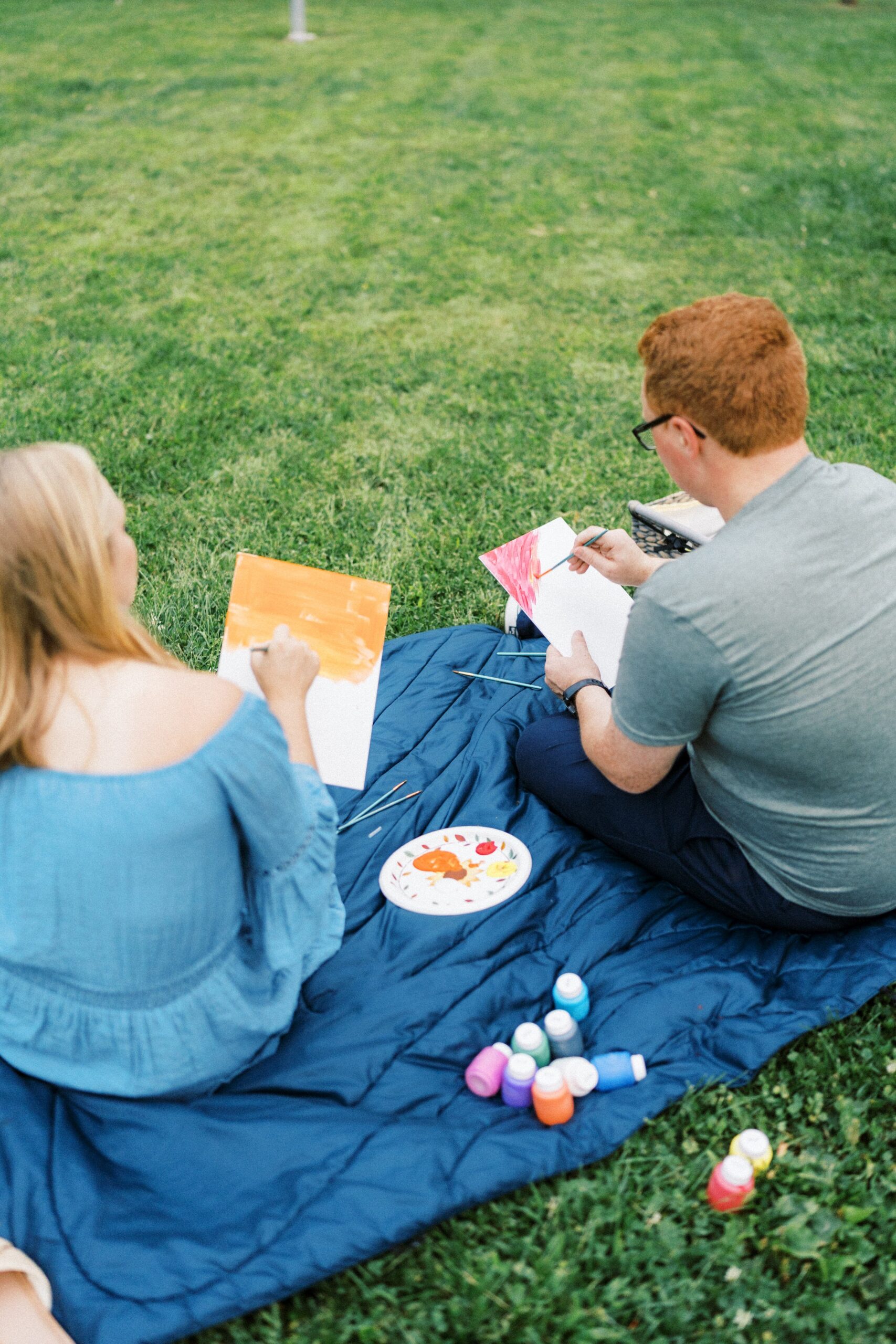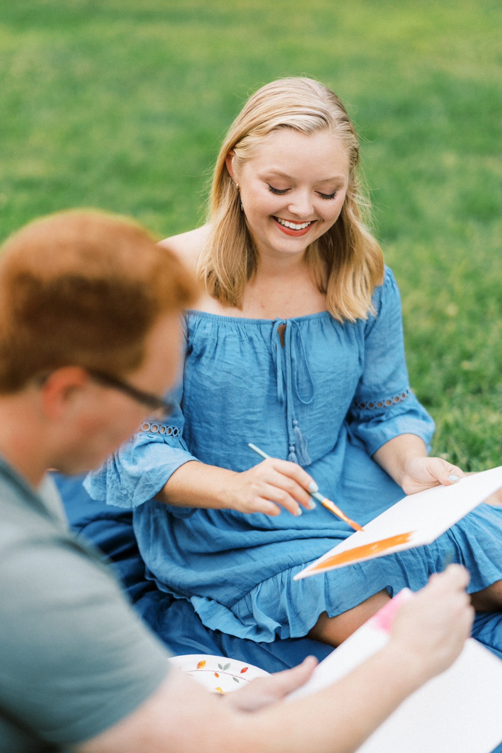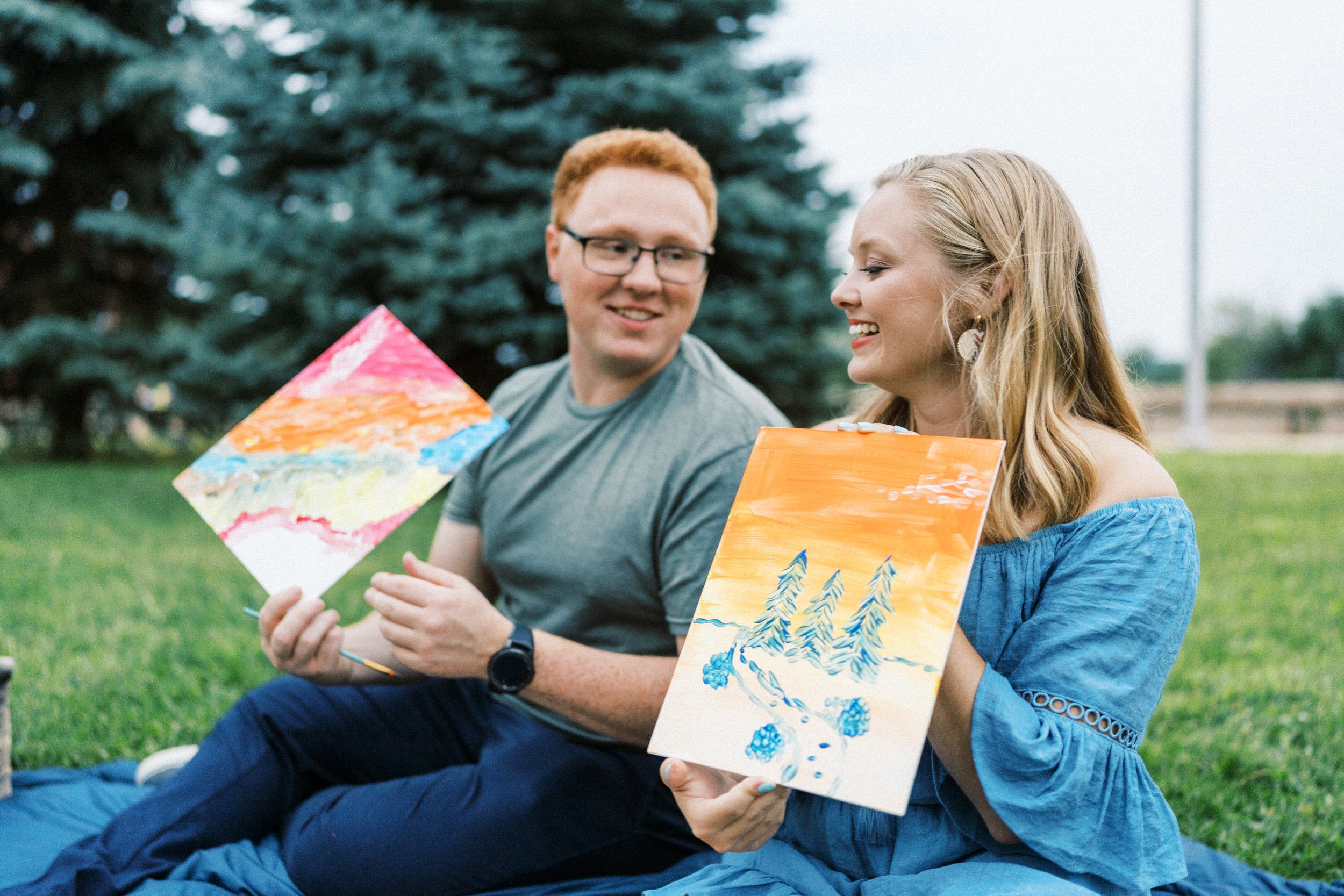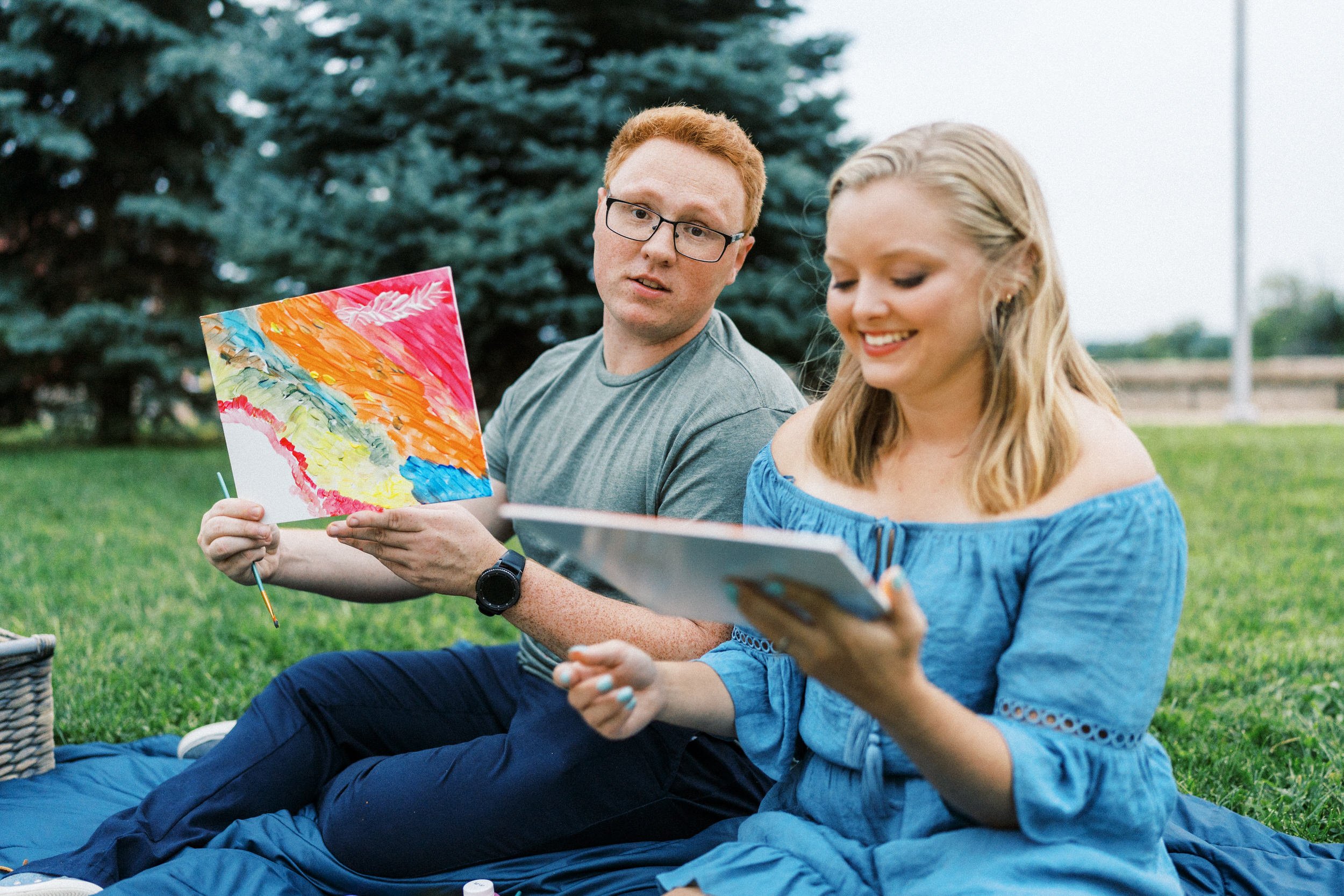 For the second part of their session, we went with something more casual and creative—a painting activity inspired by one of their favorite date nights. After a trip to the car for a quick outfit change, we came back to the park and settled in, Watching them paint together brought out so many genuine moments of laughter and connection. Kyle’s jokes and Taylor’s artistic focus made for the perfect dynamic, and the pops of color from their canvases added a fun, personal touch to the photos. This part of the session wasn’t just about the photos we captured; it was about giving them a chance to pause, play, and enjoy being together. By incorporating an activity that had real meaning for them, we created moments that they’ll look back on as part of their engagement story—not just photos.