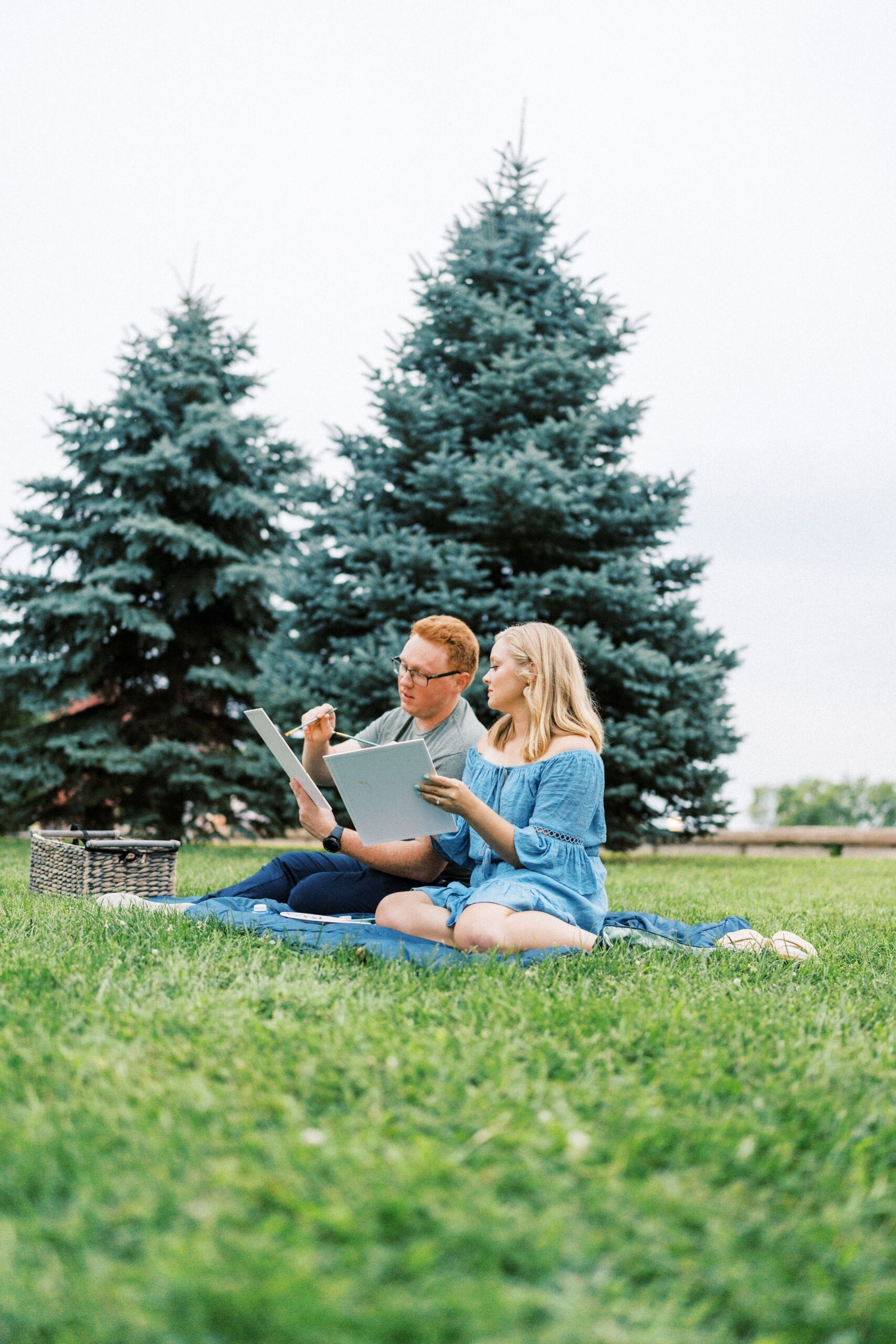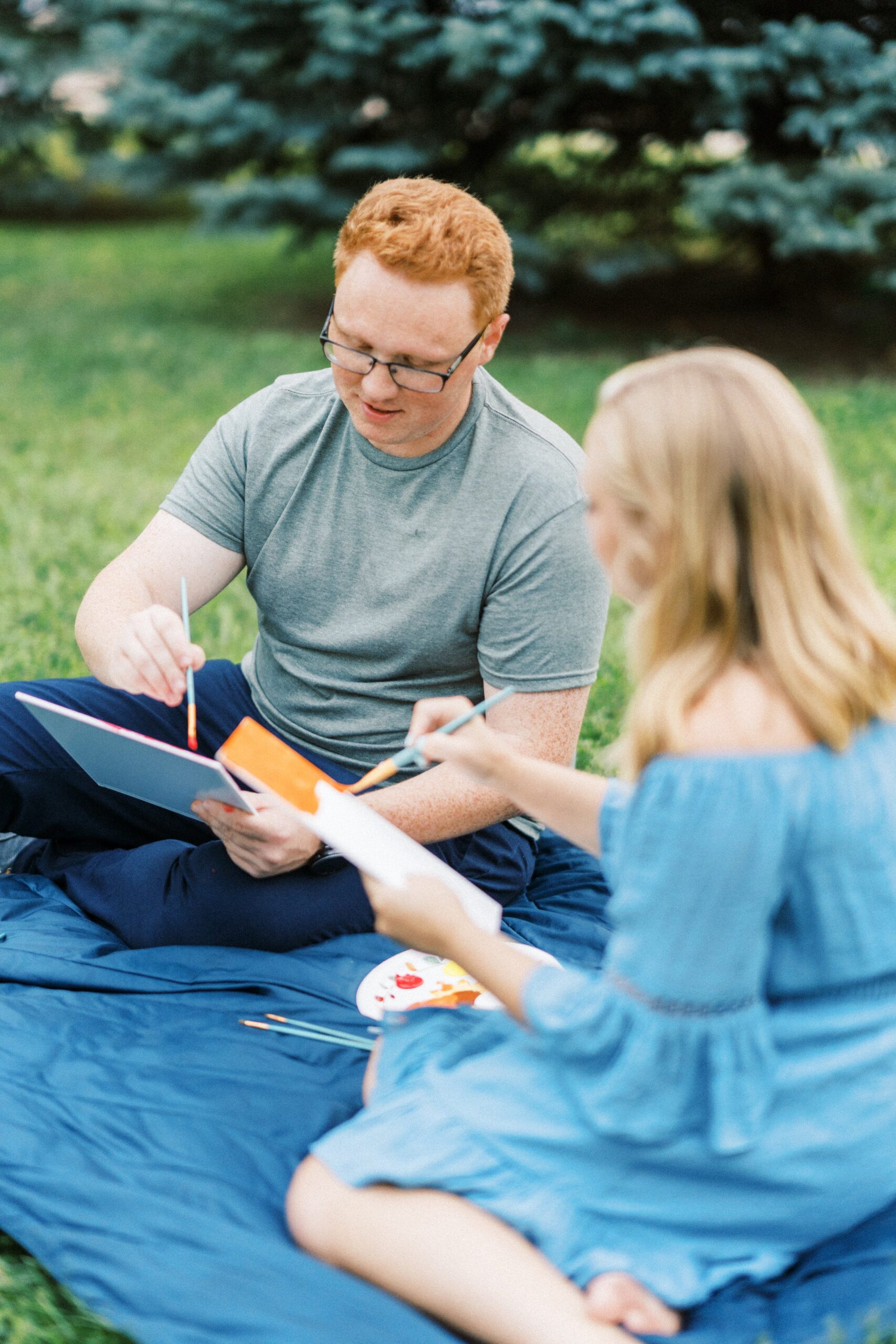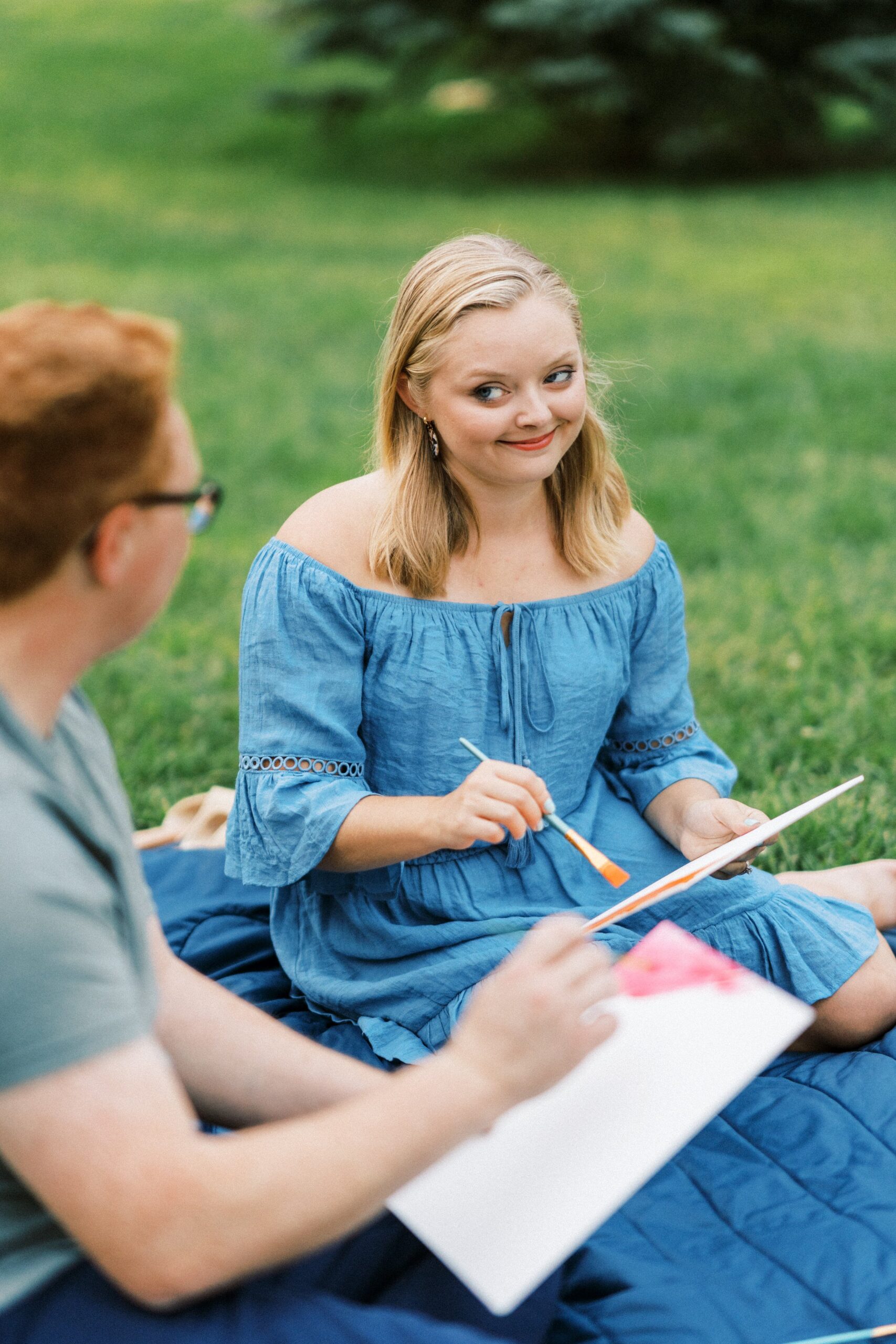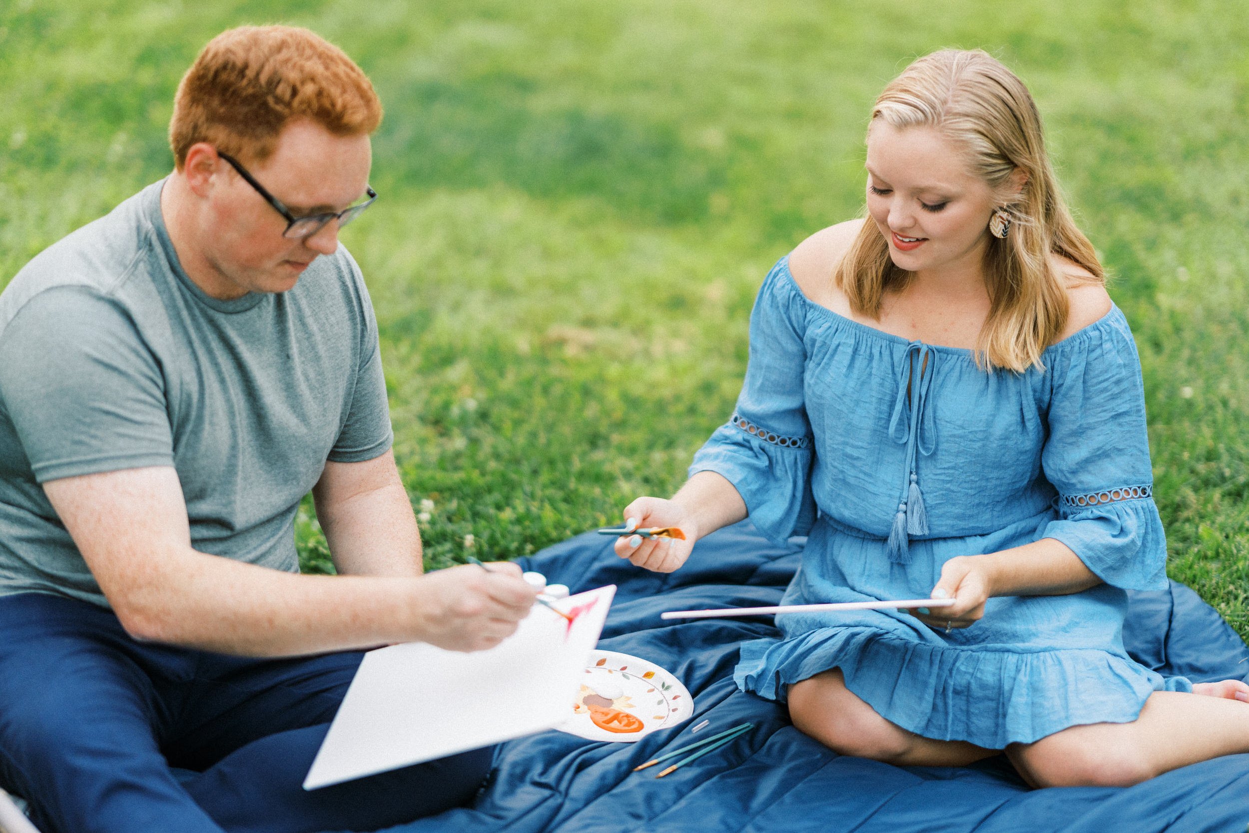For the second part of their session, we went with something more casual and creative—a painting activity inspired by one of their favorite date nights. After a trip to the car for a quick outfit change, we came back to the park and settled in, Watching them paint together brought out so many genuine moments of laughter and connection. Kyle’s jokes and Taylor’s artistic focus made for the perfect dynamic, and the pops of color from their canvases added a fun, personal touch to the photos. This part of the session wasn’t just about the photos we captured; it was about giving them a chance to pause, play, and enjoy being together. By incorporating an activity that had real meaning for them, we created moments that they’ll look back on as part of their engagement story—not just photos.