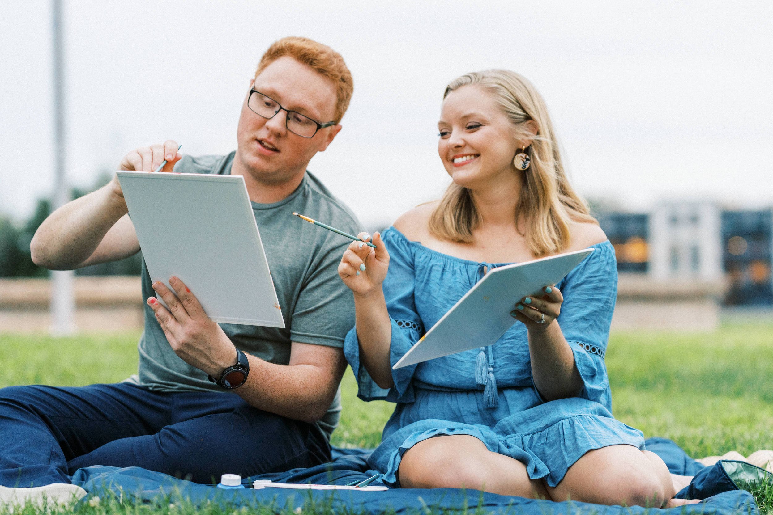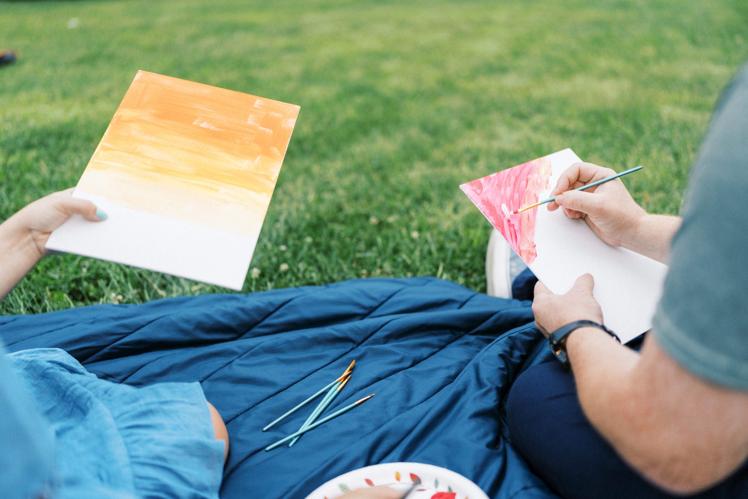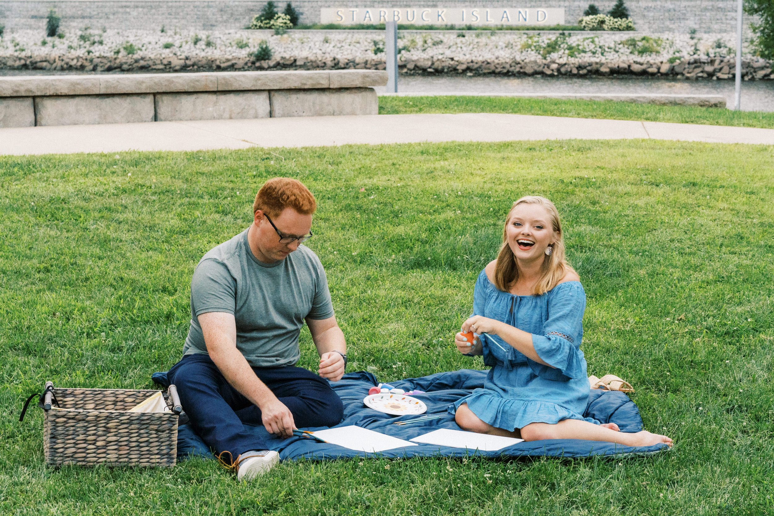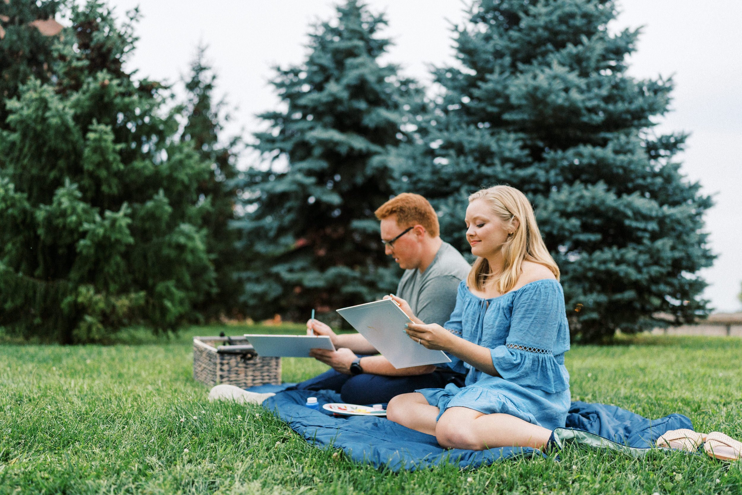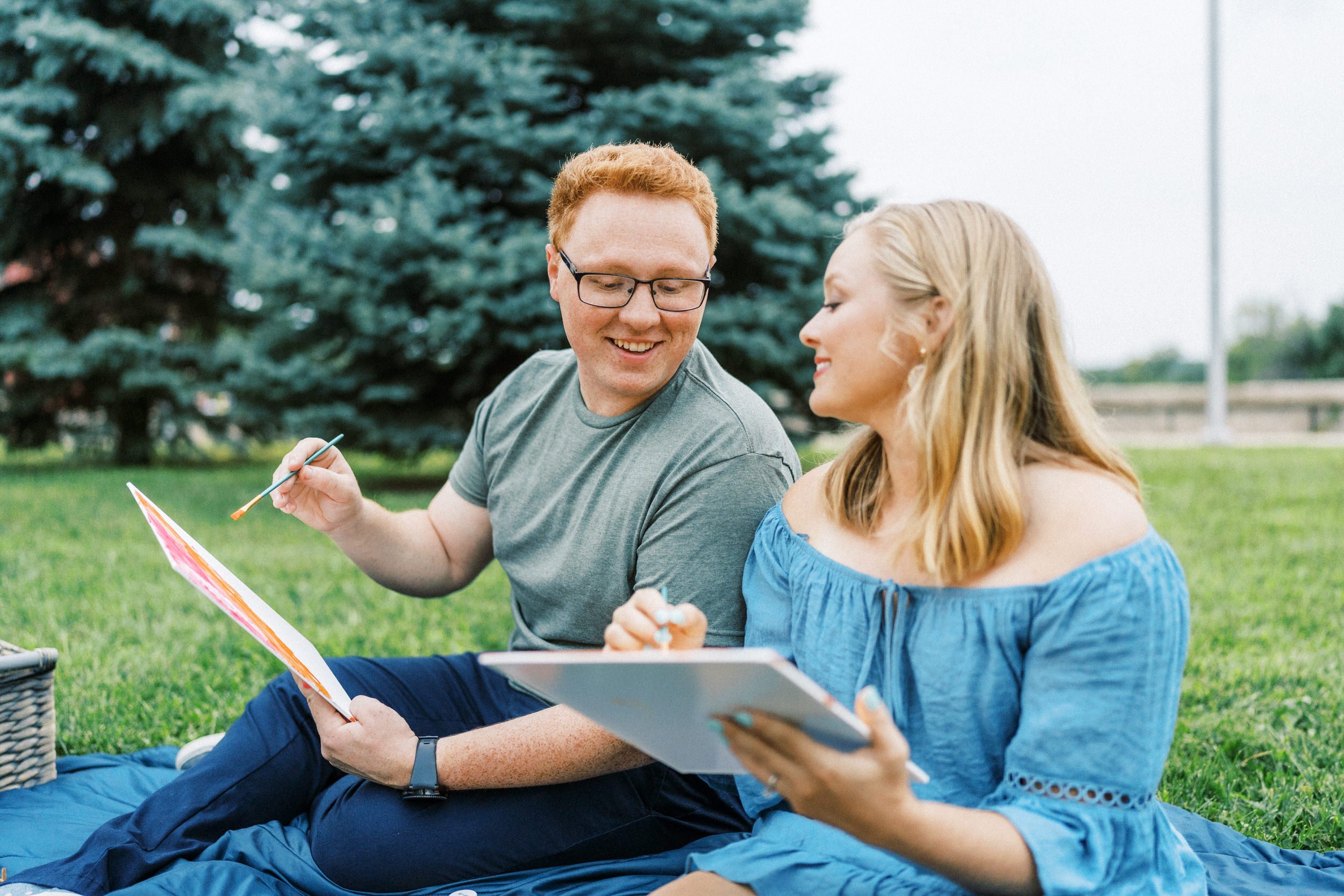 For the second part of their session, we went with something more casual and creative—a painting activity inspired by one of their favorite date nights. After a trip to the car for a quick outfit change, we came back to the park and settled in, Watching them paint together brought out so many genuine moments of laughter and connection. Kyle’s jokes and Taylor’s artistic focus made for the perfect dynamic, and the pops of color from their canvases added a fun, personal touch to the photos. This part of the session wasn’t just about the photos we captured; it was about giving them a chance to pause, play, and enjoy being together. By incorporating an activity that had real meaning for them, we created moments that they’ll look back on as part of their engagement story—not just photos.